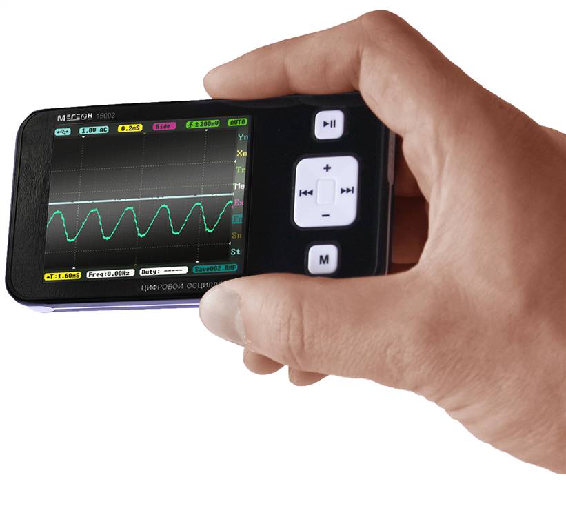 Одноканальный компактный цифровой осциллограф МЕГЕОН 15002 на базе 32-битной платформы ARM Cortex-M3 со встроенным генератором сигналов. Прибор оснащен цветным дисплеем 320х240 пикселей, встроенной памятью и USB портом для хранения данных и передачи их на ПК.