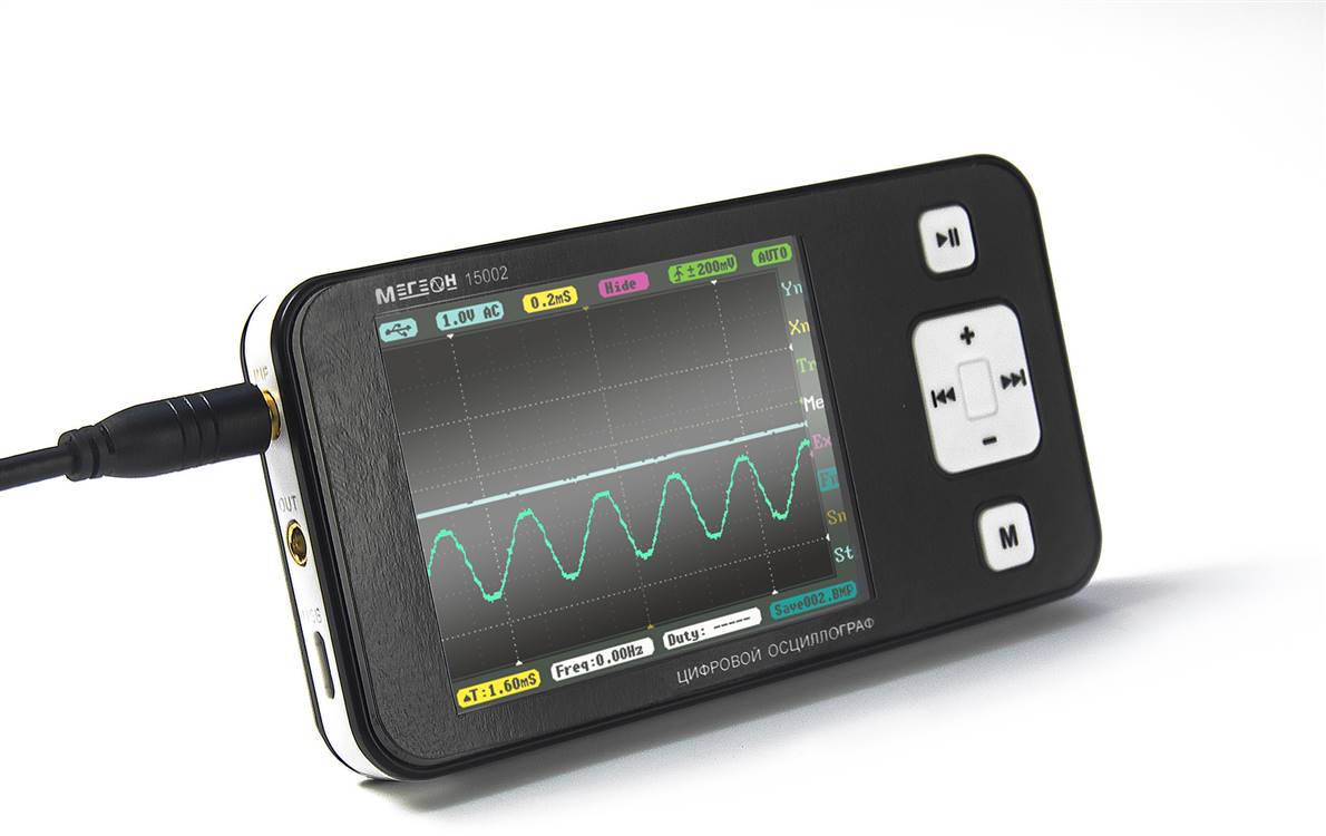 МЕГЕОН 15002 обладает компактными размерами, облегчающими его переноску и хранение. Несмотря на свои компактные размеры, осциллограф оснащен достаточно большим цветным дисплеем диагональю 2.8", на котором отображаются необходимые параметры анализируемого сигнала. Полоса пропускания составляет до 200 кГц, позволяя детально изучать высокочастотные сигналы.